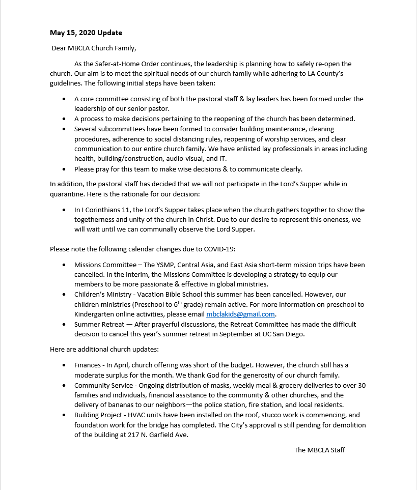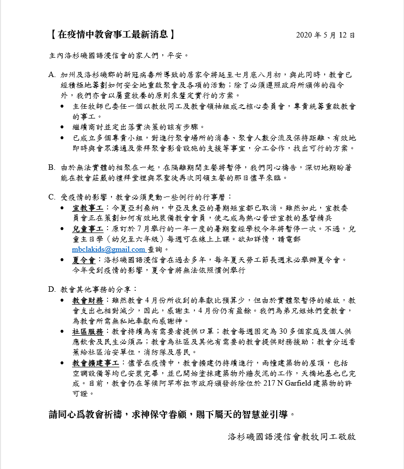 各位親愛的弟兄姊妹們,在上週的更新中,我們報告了教會重啟的七項關鍵程序。在我們持續為策劃完成這七項程序而努力的同時,我們也密切注意疫情在加州及洛杉磯郡的發展。對近日新冠肺炎單日確診人數及死亡人數的持續飆高,我們深表關切。
